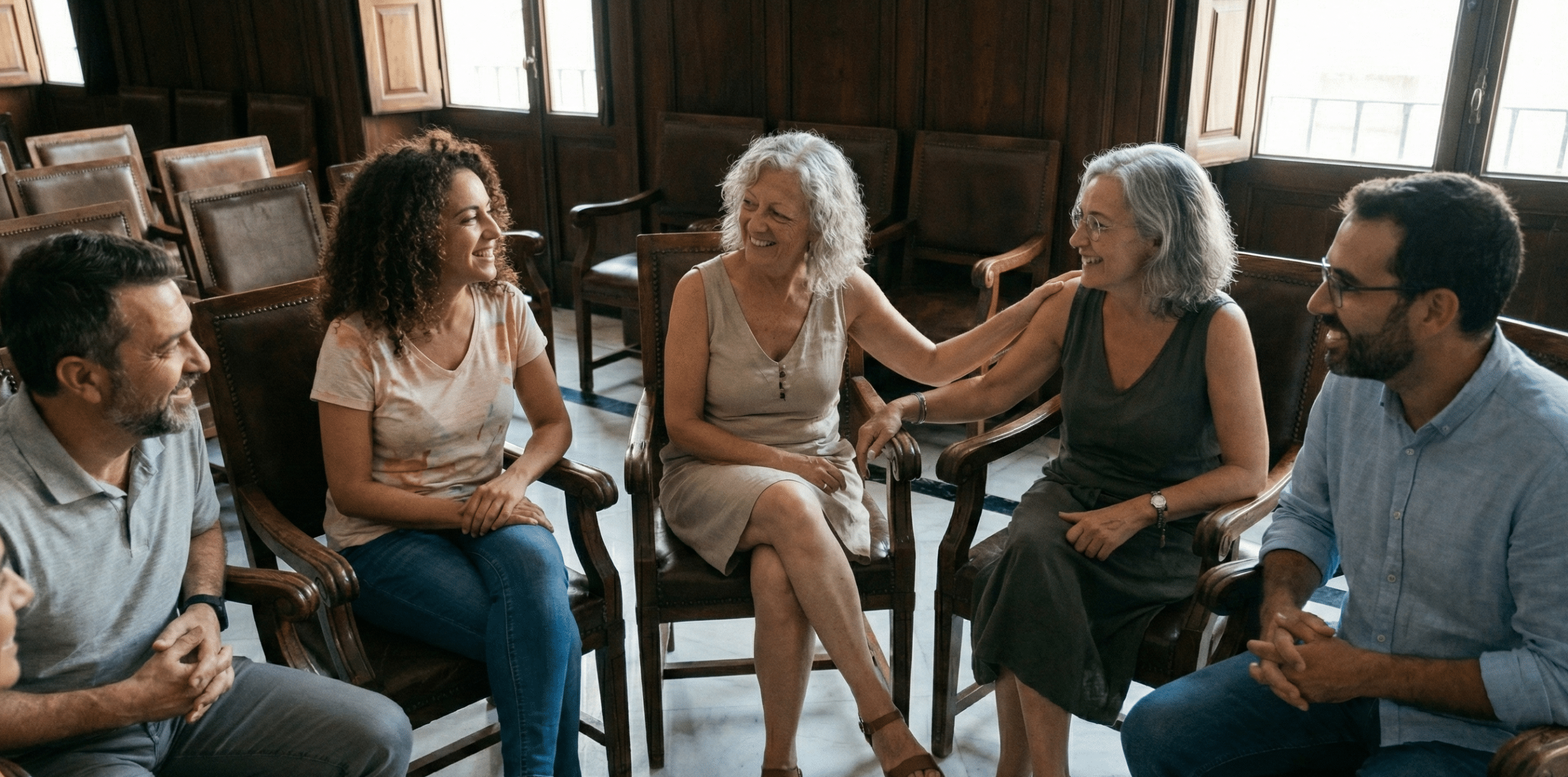 Espacios horizontales de apoyo entre iguales, coordinados por el área psicológica para asegurar la seguridad, contención emocional y creación de redes sólidas en Sevilla.